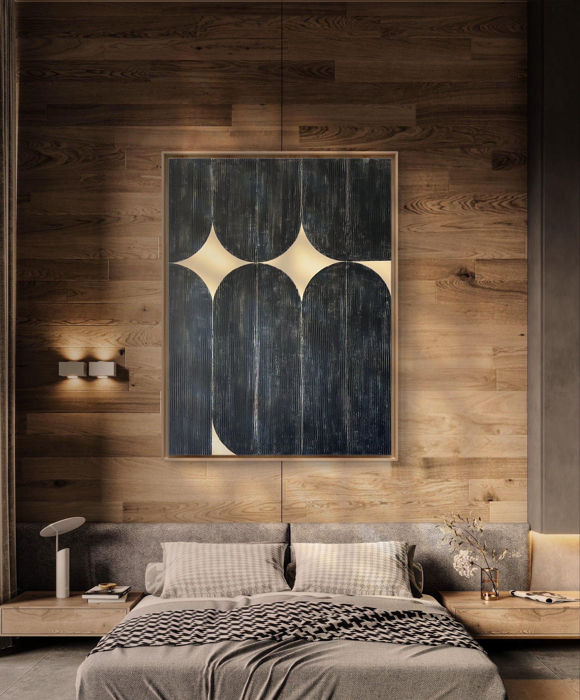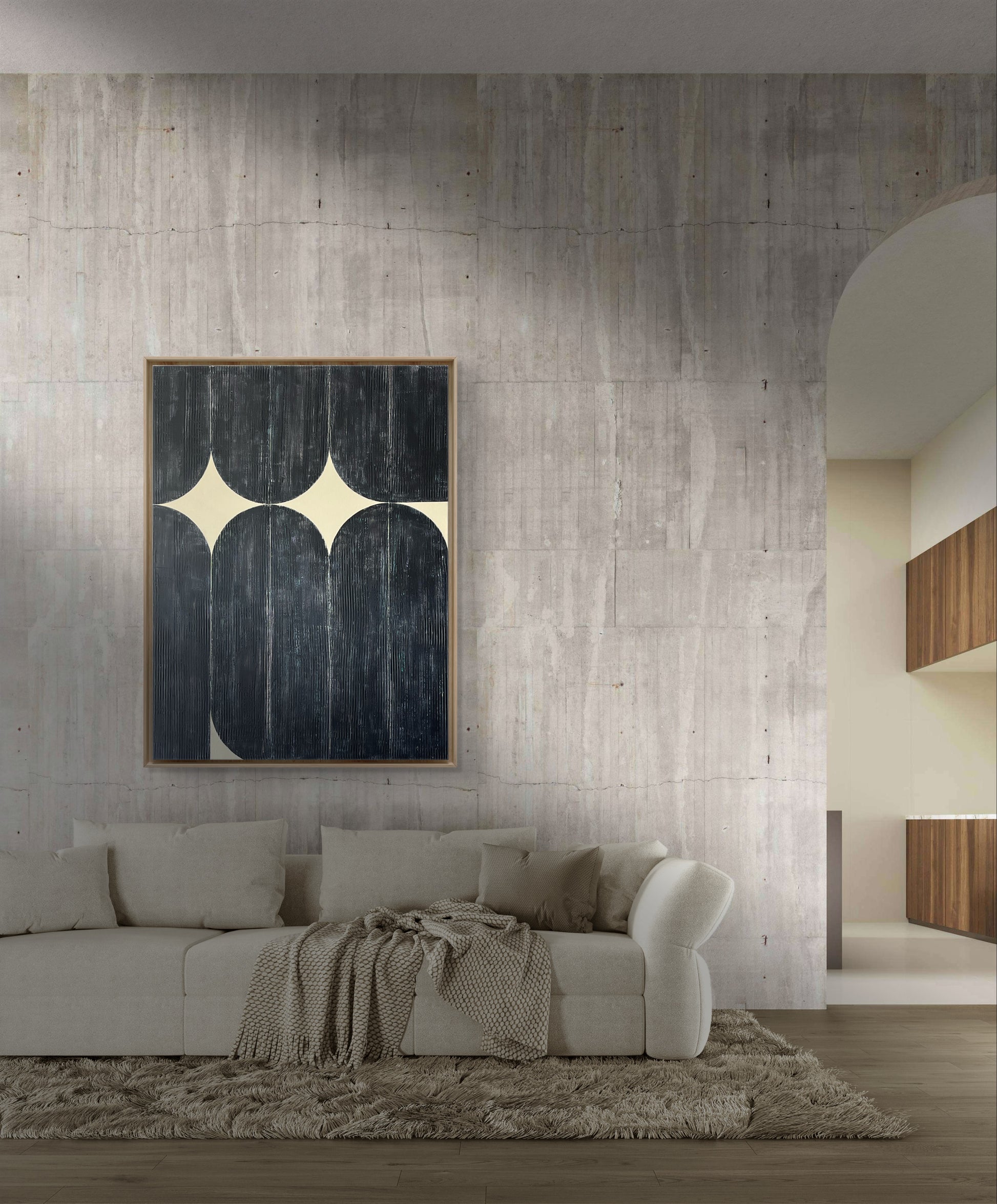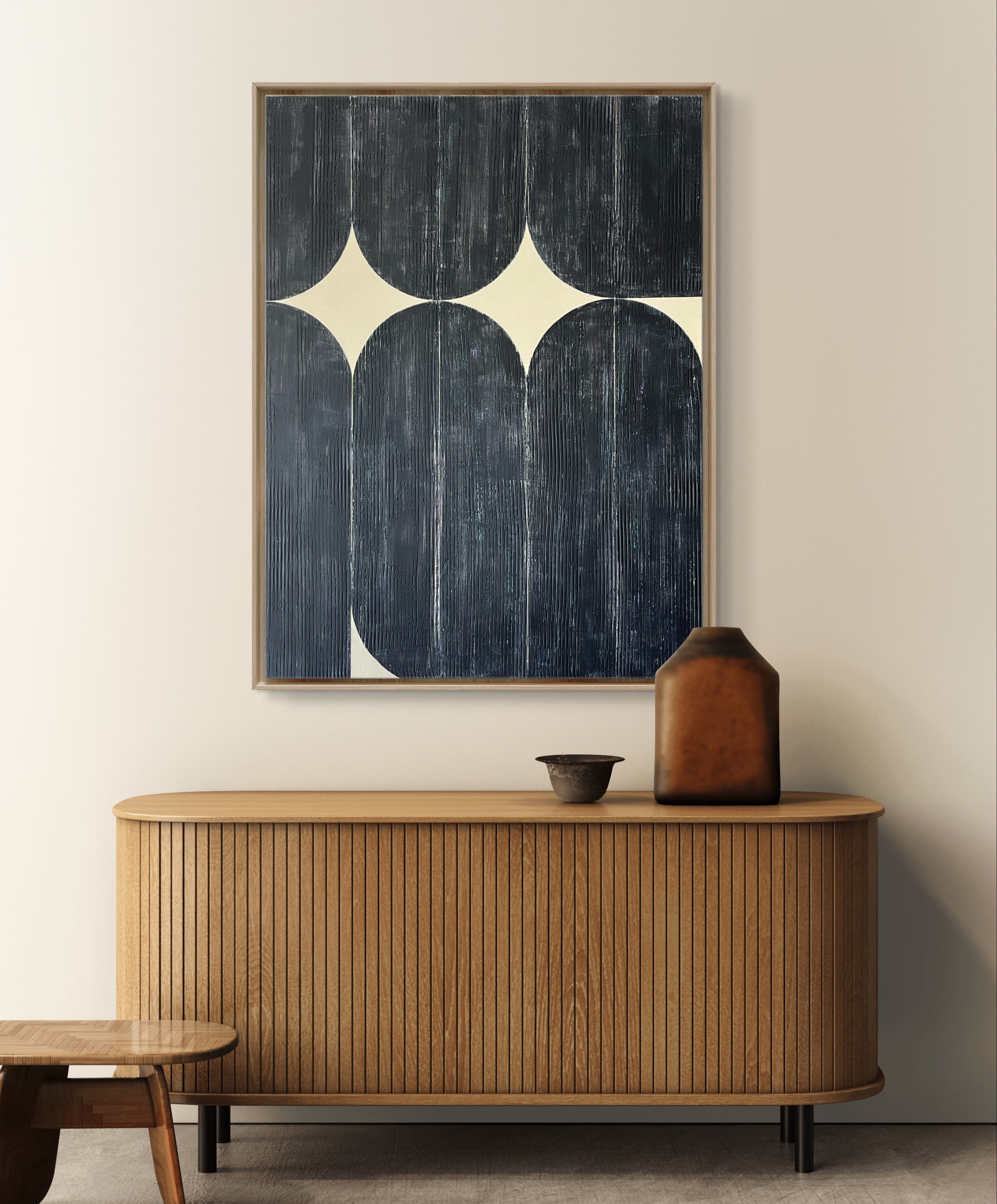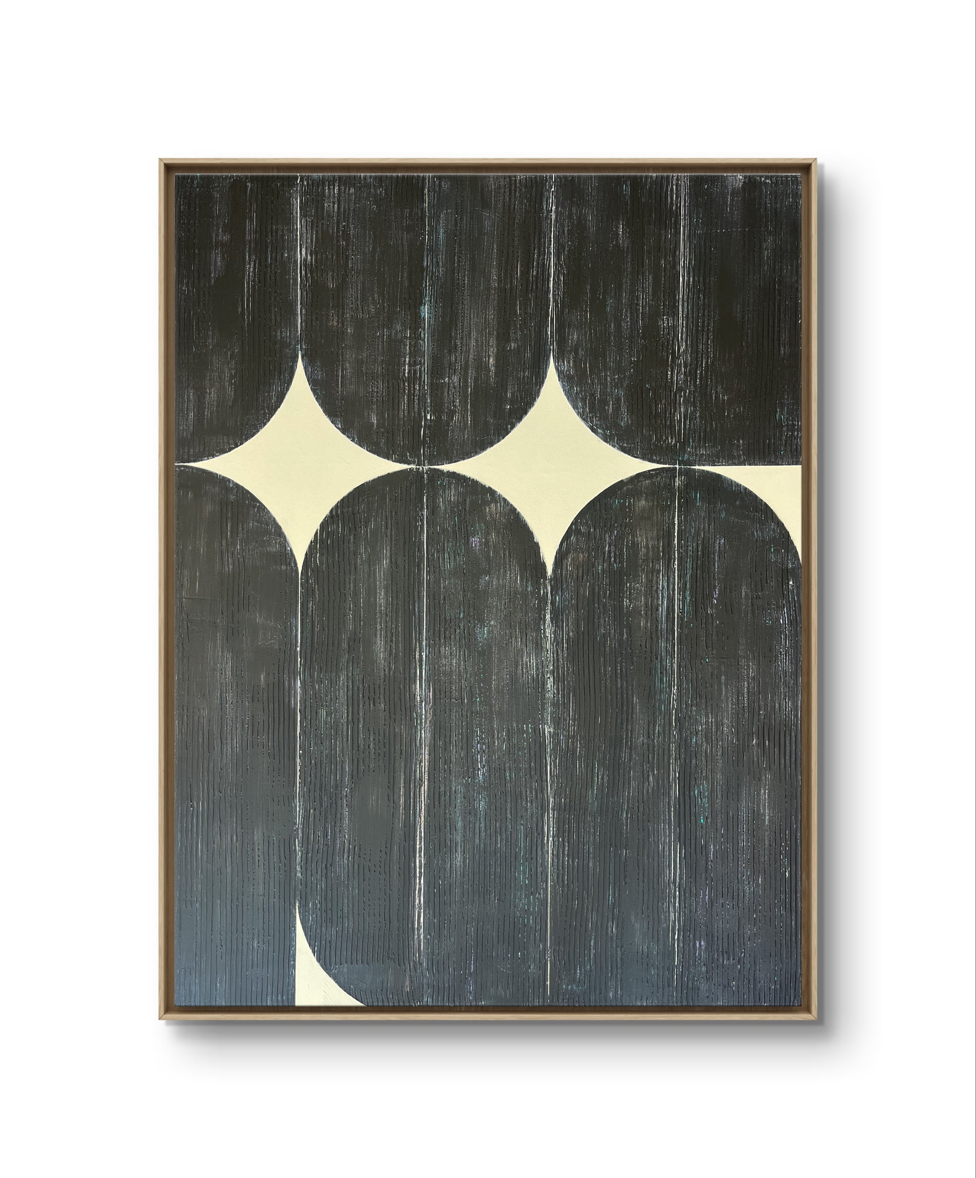 Original acrylic mixed media on canvas, sealed with protective matte varnish. 30" x 40" x 1.5" (Canvas size), Signed on the back. With a clear finished maple floating frame ready to hang.