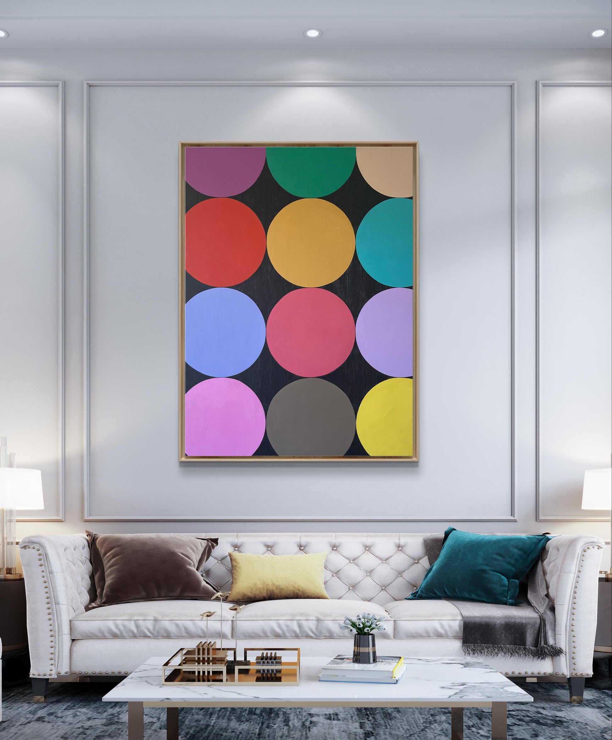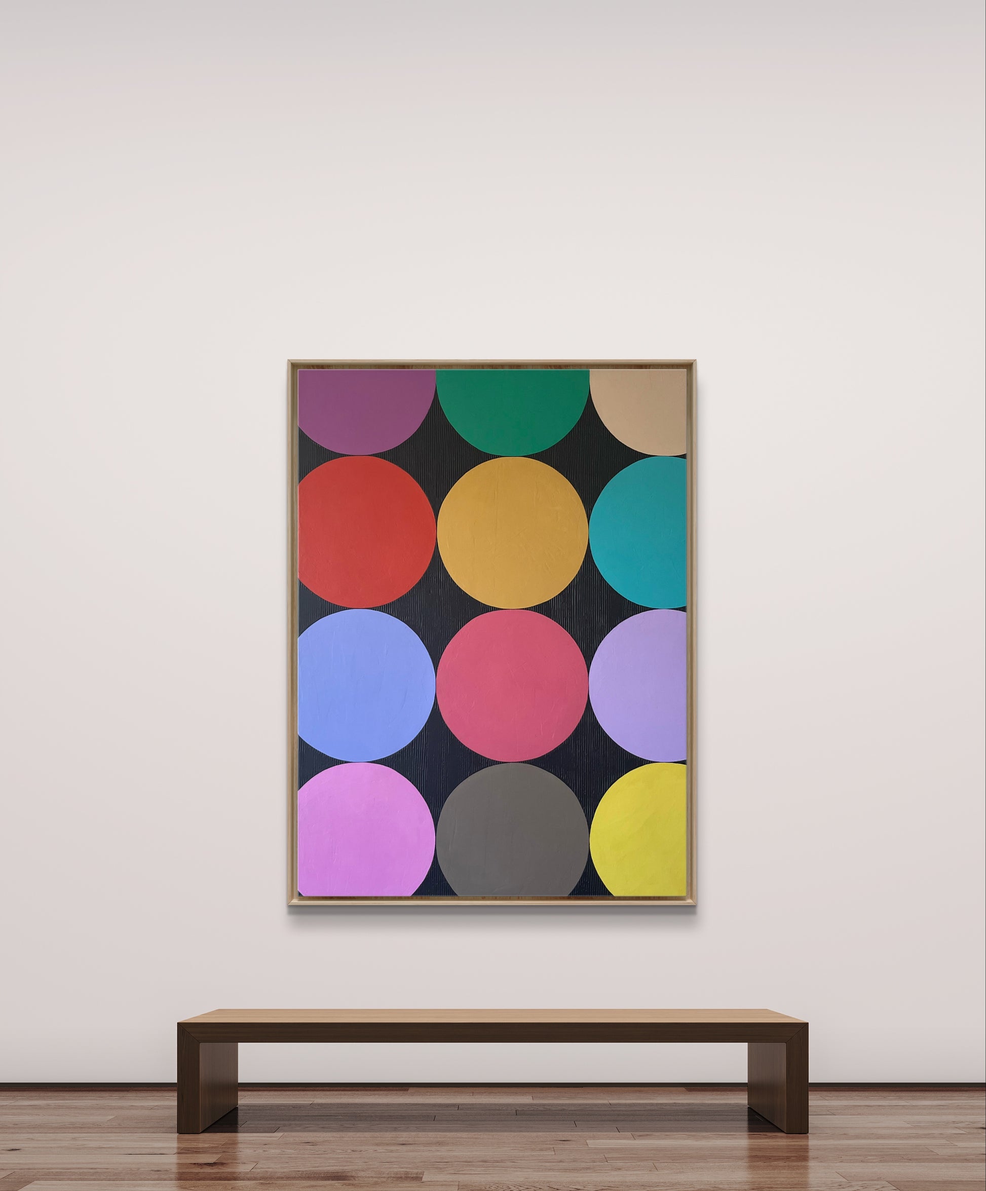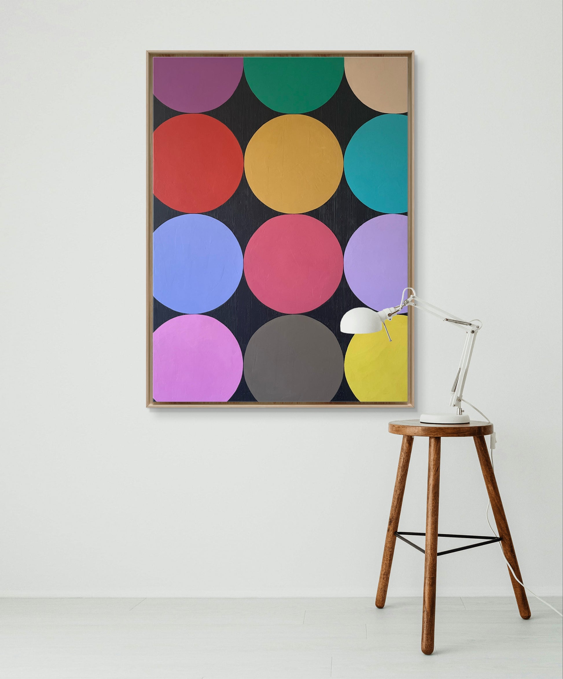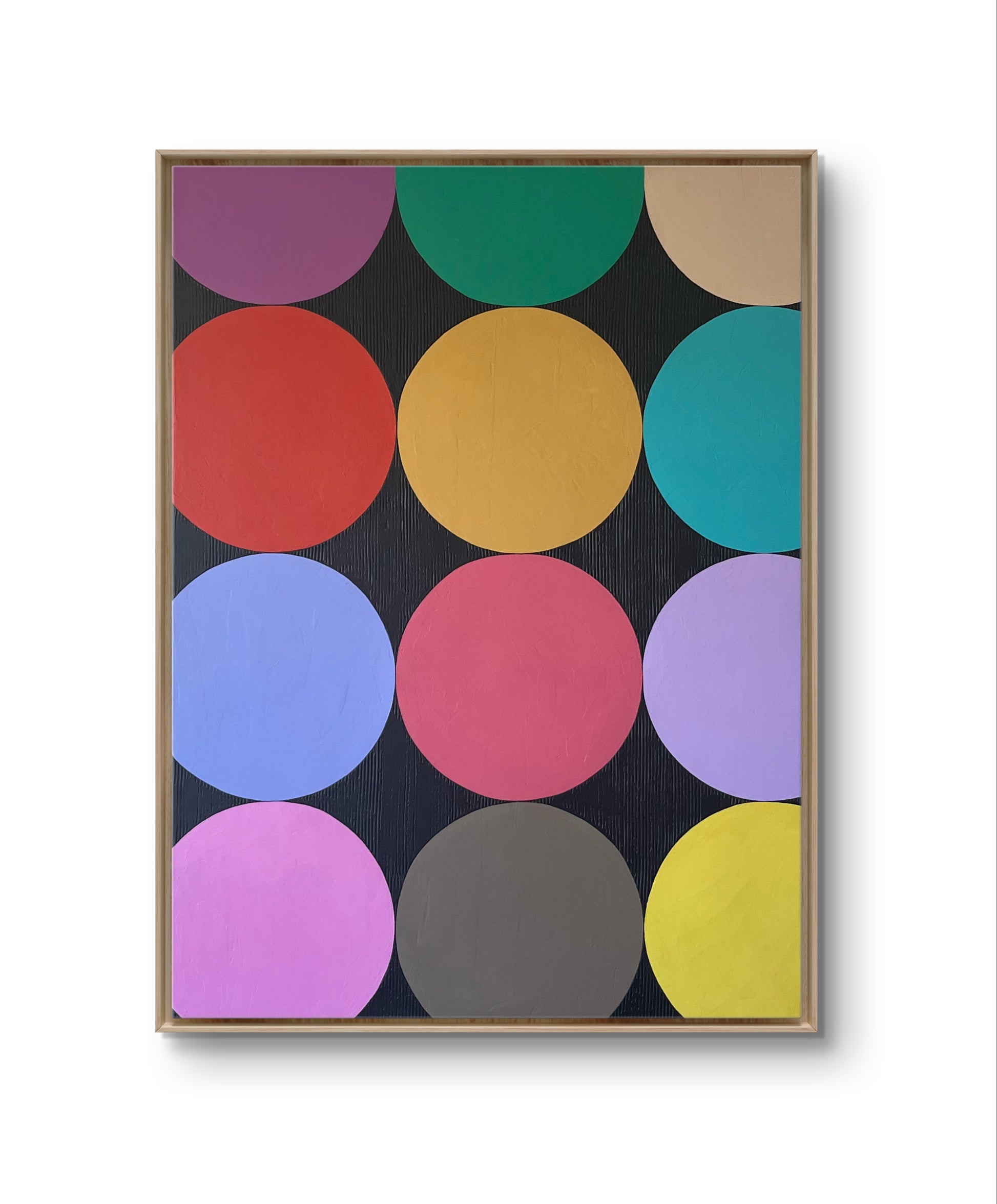 Original acrylic mixed media on canvas, sealed with protective matte varnish. 36" x 46" x .75" (Canvas size), Signed on the back. With a clear finished maple floating frame, ready to hang.