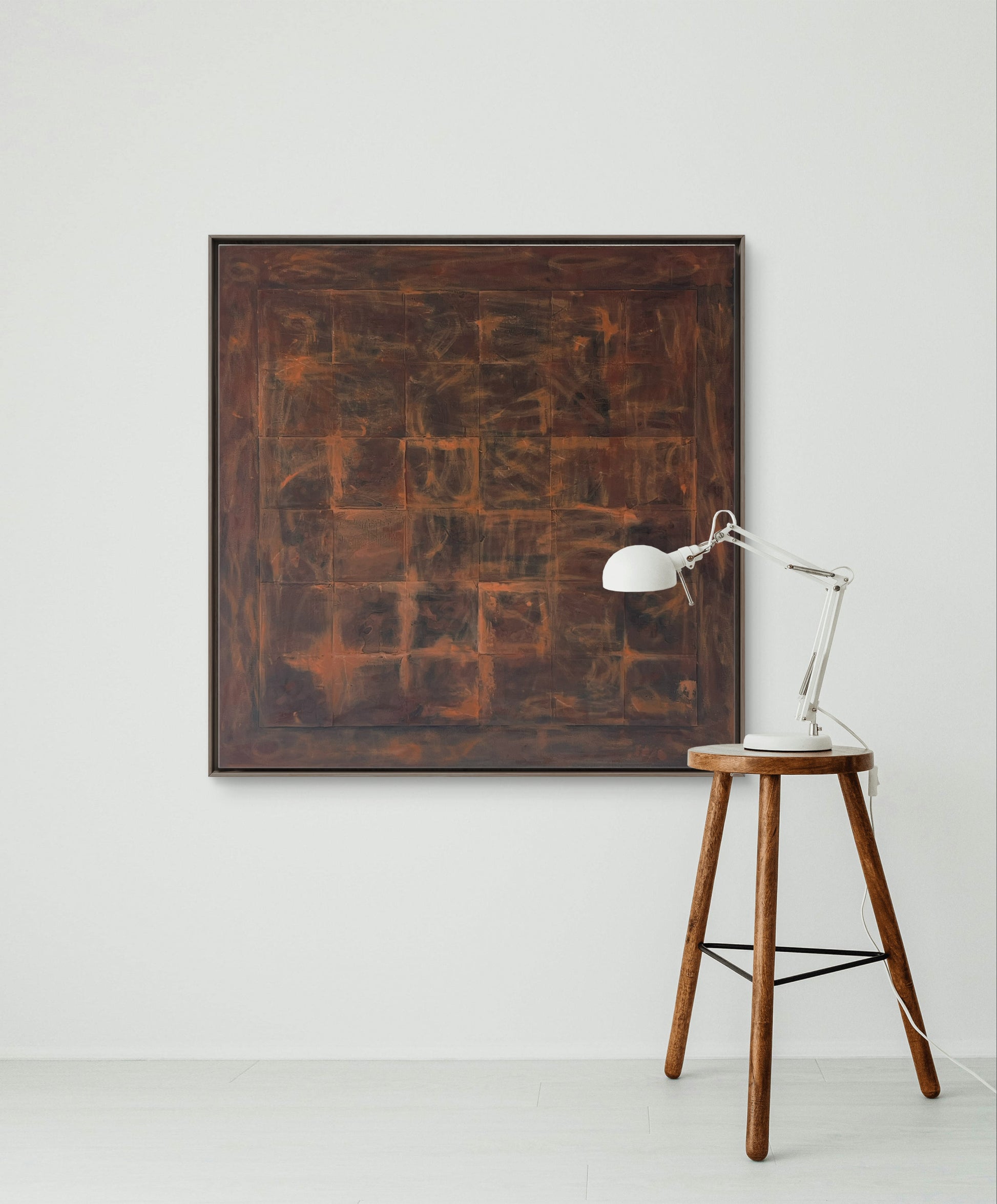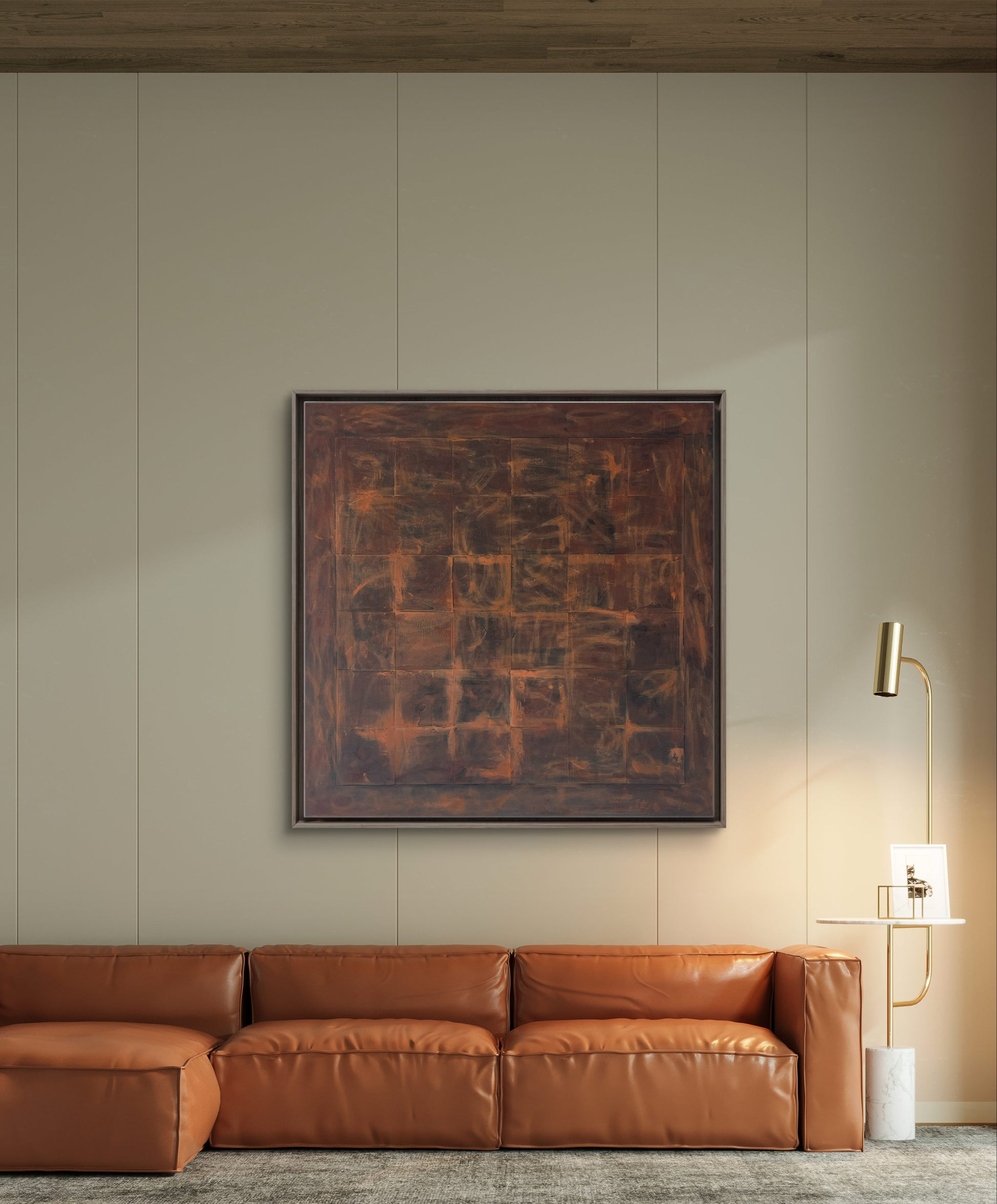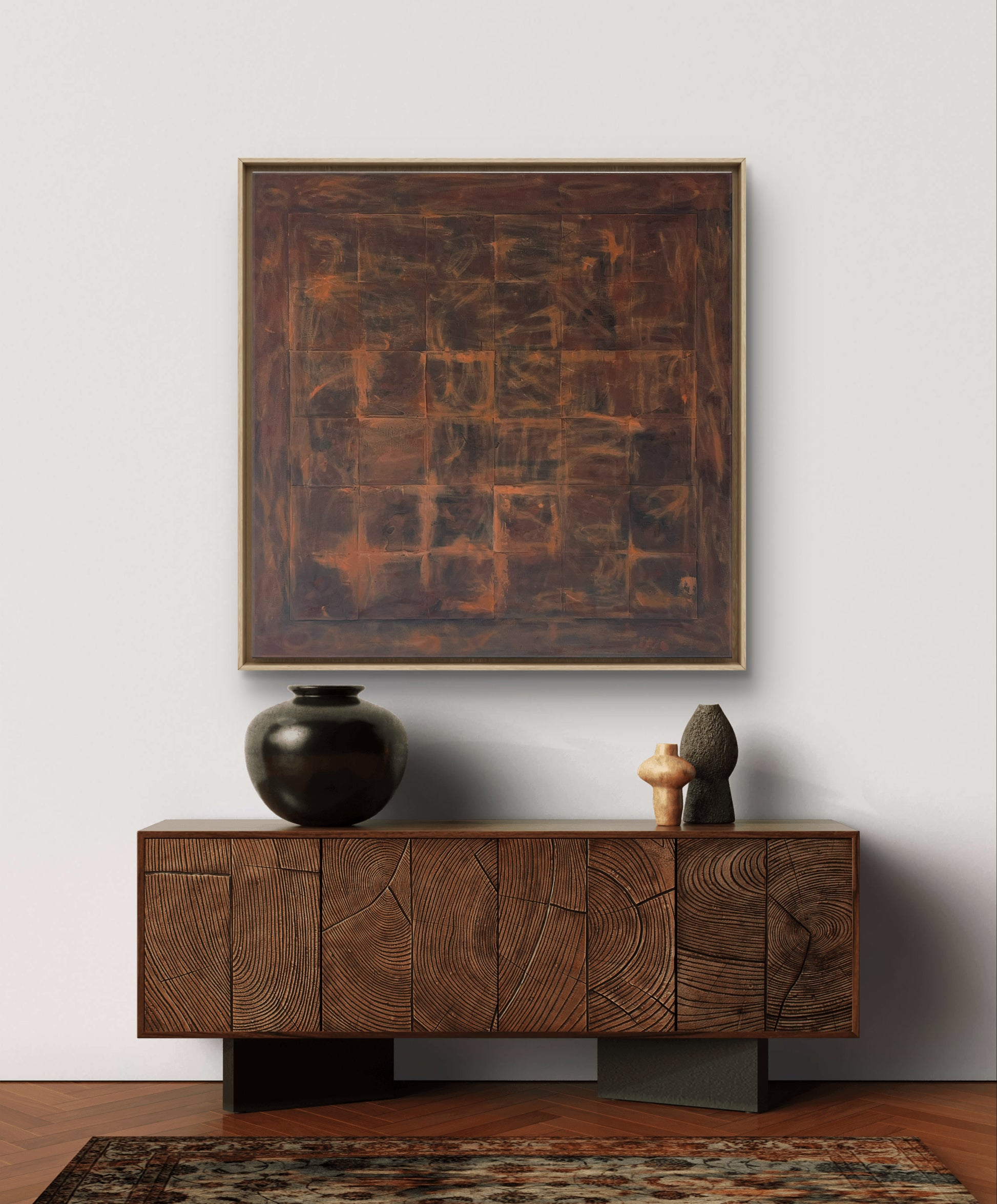 Original acrylic mixed media on canvas (Rusted technique), sealed with protective matte varnish. 36" x 36" x 1.5" (Canvas size), Signed on the back. Unframed.
